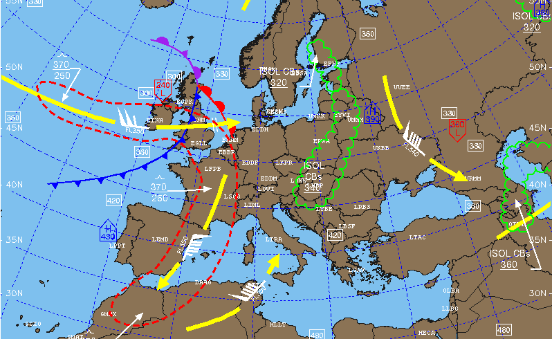 نقشه و نمودار هواشناسی كه اطلاعات مهم [ب و هوا بر روی آن مشخص شده است.