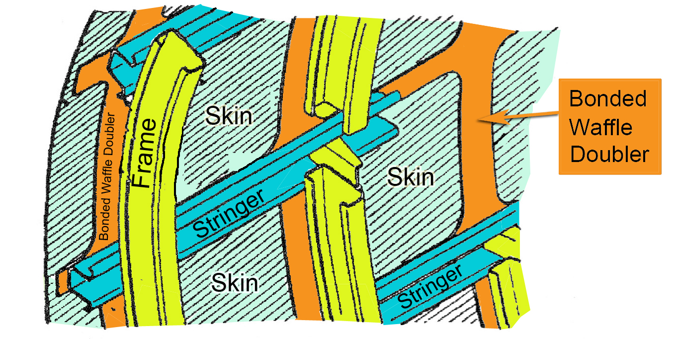 A Waffle Doubler is a kind of aluminum sheet mesh that attaches to the inside of the aircraft skin ( between skin and stringer and frame ). If a crack occurs in the outer skin, it continues to propagate until it runs on the Doubler. There, the crack can no longer grow and is deflected. This facilitates its discovery in a visual inspection.