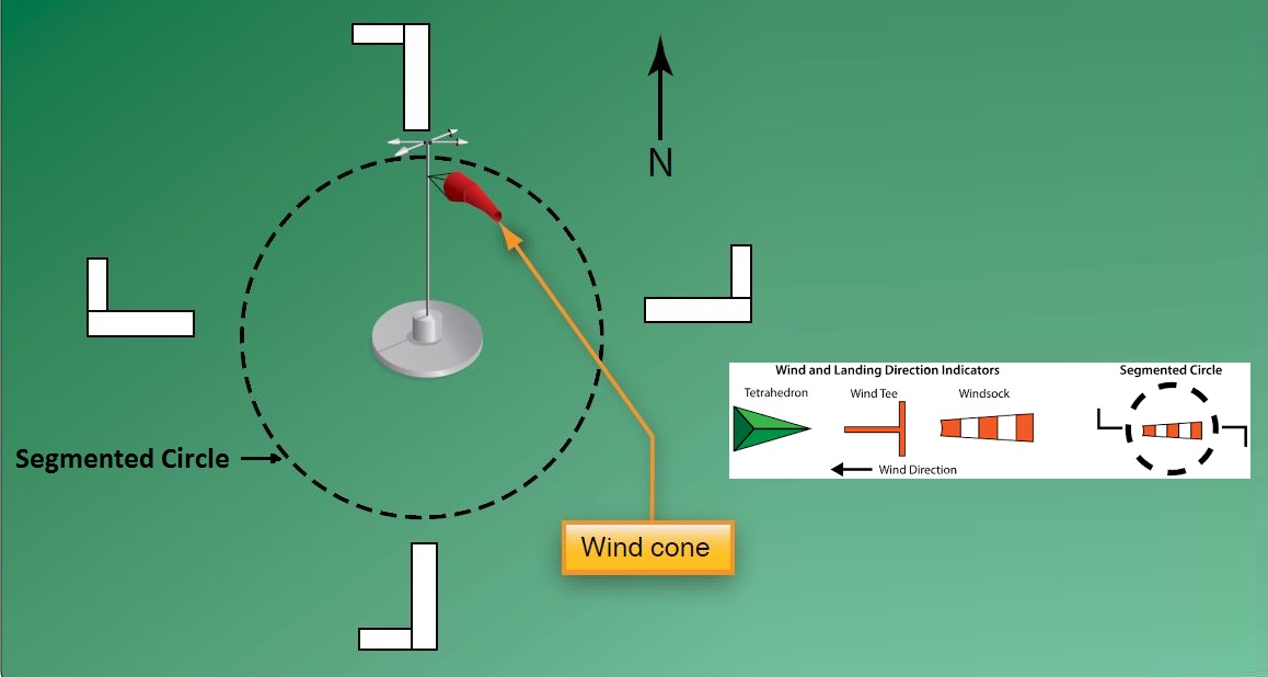 A visual indicator around a windsock or tetrahedron designed to show the traffic pattern for each runway. Segmented circles are used at airports without operating control towers, and which have some runways with right-hand traffic patterns and others with left-hand patterns.