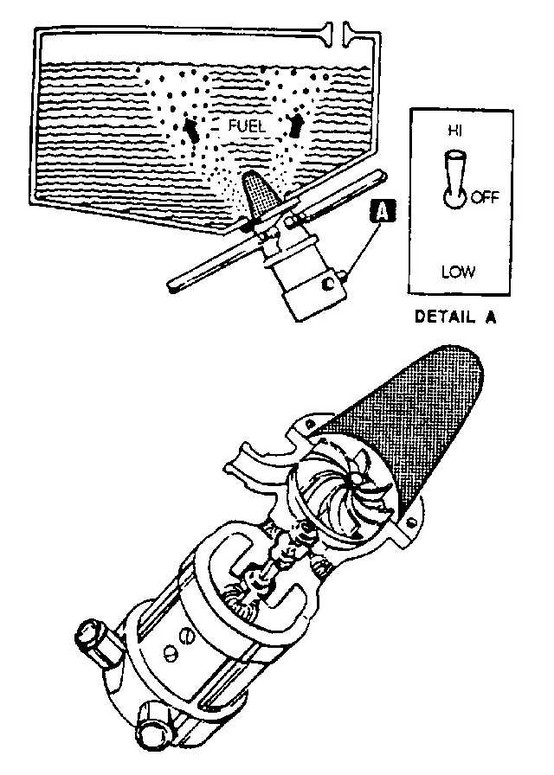 An electrically driven centrifugal pump mounted in the bottom of the fuel tanks in large aircraft. Boost pumps are used to provide a positive flow of fuel under pressure to the engine for starting and to serve as an emergency backup in the event the engine-driven pump should fail. They are also used to transfer fuel from one tank to another and to pump fuel overboard when it is being dumped. Boost pumps maintain pressure on the fuel in the line to the engine-driven pump to prevent a vapor lock forming in these lines. Centrifugal boost pumps have a small agitator propeller on top of the pump impeller. This agitator causes the vapors in the fuel to be released before the fuel leaves the tank.