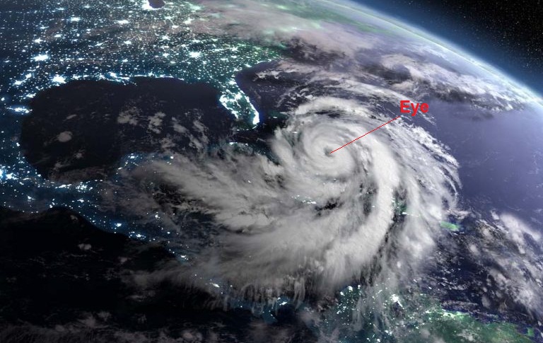 In meteorology, the roughly circular area(typically 30–65 kilometers or 19–40 miles in diameter.) of calm or relatively light winds and comparatively fair weather at the center of a well developed tropical cyclone. A wall cloud marks the outer boundary of the eye.