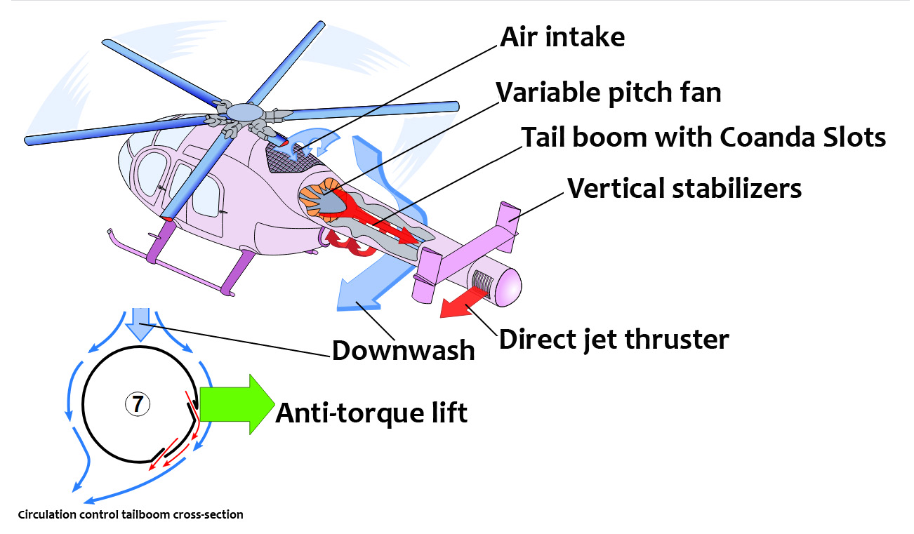 A helicopter that does not have a tail rotor. This technology was first developed by McDonnell Douglas Helicopters. In this system, instead of a tail rotor, a large fan is used at the beginning of the tail boom, which sends a large volume of low-pressure air to the end of the tail boom. In the middle of the tail boom, there are two relatively long and downward grooves through which part of the air driven by the fan passes and create two boundary layers around the tail boom and create the Coanda effect, at this time a part of the air that is pushed downwash by main rotor is attached and stick to the boundary layers , which creates anti-torque force.