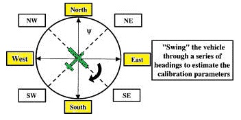 این روش برای محاسبه و تصحیح اثرات میدان مغناطیسی هواپیما بر قطب نمای مغناطیسی آن است. هواپیما با تمام شرایطی که معمولاً در طول پرواز دارد به منطقه تعیین شده منتقل می شود و سپس با چرخاندن هواپیما و قرار دادن آن در راستای جهت های مختلف انحراف قطب نمای آن را اندازه گیری می کنند و اصلاحات روی قطب نما اعمال می شود. در صورت باقی ماندن انحراف ، مقادیر آن روی کارت تصحیح قطب نما نوشته شده و در زیر قطب نما نصب میگردد .