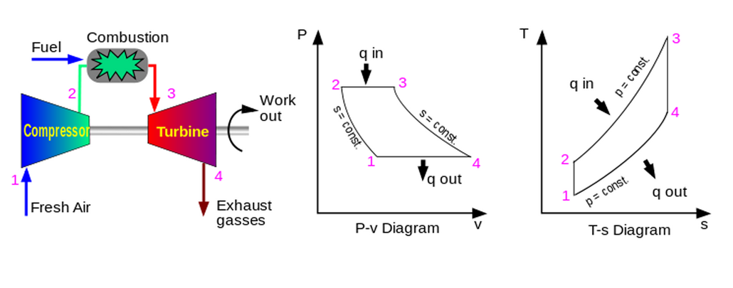 مدار برایتون، مراحل تبدیل انرژی در موتورهای توربینی ، در این مراحل هوای آزاد با حجمی ثابت و فشار جو وارد موتور شده و توسط کمپرسور متراکم می شود. این تراکم با ازدیاد فشار و دما و کاهش حجم همراه است. در محفظه احتراق هوای متراکم با سوخت محترق می شود که این عمل باعث افزایش حجم می شود. (۲ به ۳) گازهای سوخته شده با سرعت زیاد به توربین وارد و همراه کاهش فشار حجم آن افزایش پیدا می کند و پس از آن با همین حالت از دهانه جت خارج می شود و این مراحل مجددا تکرار میشود.