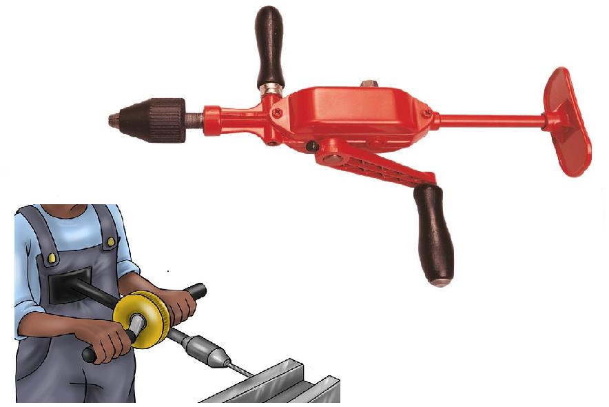 A handheld drill motor used to drill relatively large holes in wood or metal. the handle of the drill motor is fitted with a curved plate that allows the user to apply a pushing force with his upper body as the drill cuts the hole.