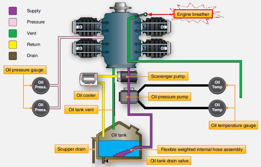 A vent line in an aircraft engine that allows the air pressure inside the engine crankcase to be the same as the pressure of the surrounding air. An effective breather system prevents pressure building up inside the engine and forcing oil out of the crankcase.