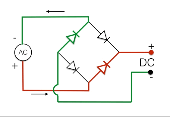 An electrical rectifier circuit using four diodes to change alternating current into full-wave rectified direct current.