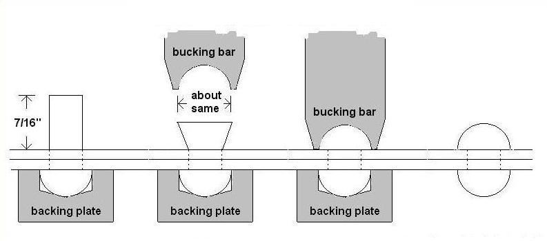 The process in which a shop head is formed on a solid aircraft rivet. The rivet is inserted into holes drilled through the metal sheets being joined. The manufactured head of the rivet is hammered with a pneumatic hammer through a rivet set that fits the shape of the head. A hardened-steel bucking bar is held against the shank of the rivet, and the hammering causes the end of the shank to expand and become shorter, forming the shop head that clamps the metal pieces together.