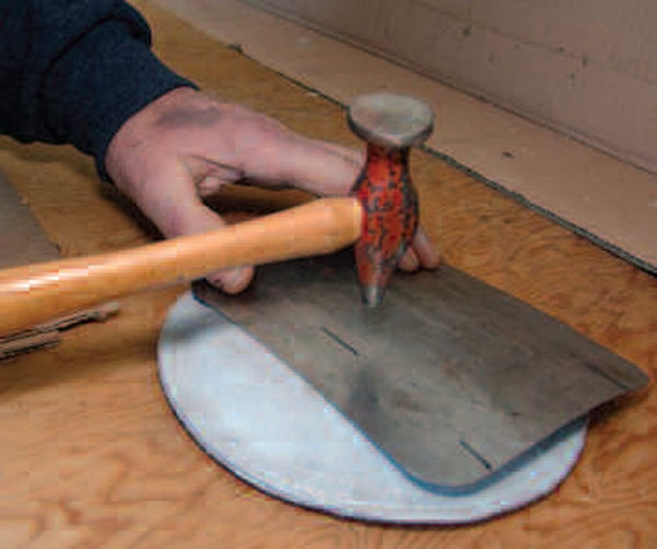 A method of shrinking or stretching sheet metal into compound curves by hand-hammering it into a sandbag or into or around wood or metal forming blocks.