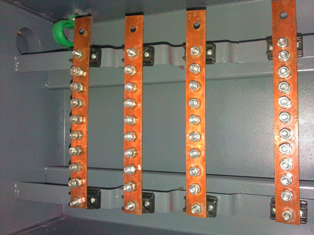 A system of electrical conductors in a generating or receiving station on which power is concentrated for distribution.