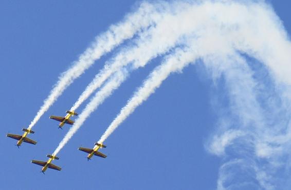 Loops, rolls, and other feats of spectacular flying performed in one or more aircraft to entertain an audience on the ground.