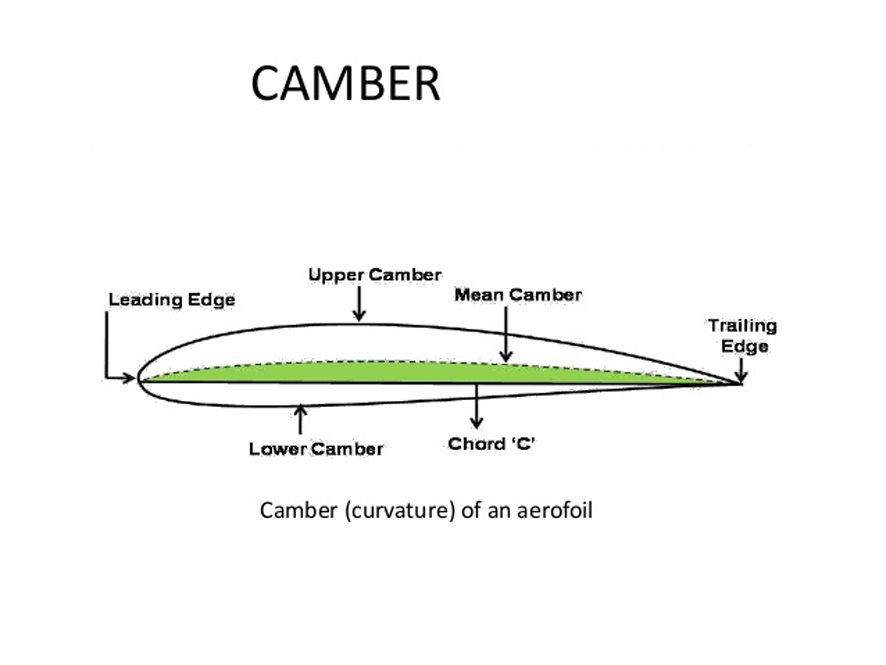 The amount of curve of an airfoil section. The curve on the top of the airfoil is called the upper camber, and the curve on the bottom is called the lower camber. The mean camber is a line drawn through a series of points, each of which is located midway between the upper and the lower camber.