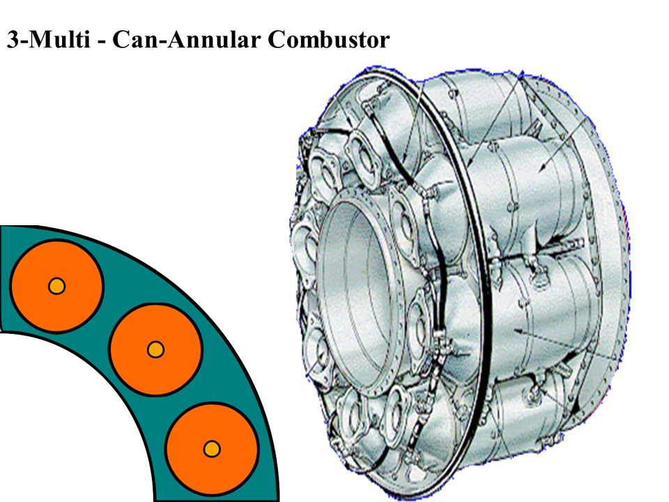 A type of combustor used in some of the large turbojet and turbofan engines. It consists of individual cans into which the fuel is sprayed and ignited. These cans all mount on an annular duct through which the hot gases from the individual cans are collected and directed uniformly into the turbine.