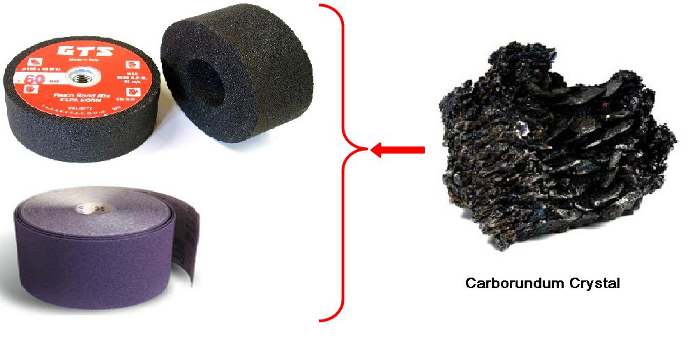 The registered trade name for several types of man-made abrasives. Carborundum is similar to emery (a natural abrasive), and it is used to make grinding wheels. Fine particles of Carborundum are bonded to paper and cloth to make sheets and strips of abrasive materials.