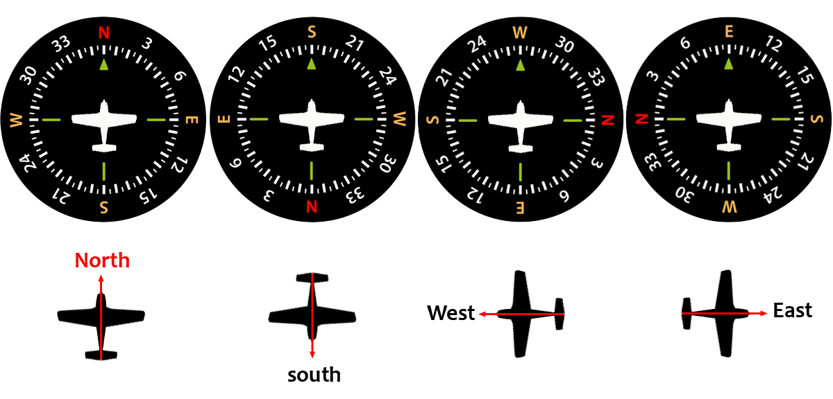 زمانیکه دماغه هواپیما ( یا به عبارت صحیحتر محور طولی هواپیما ) در راستای یکی از جهات اصلی چهارگانه شمال، جنوب و مشرق و مغرب روی قطب نمای هواپیما باشد.