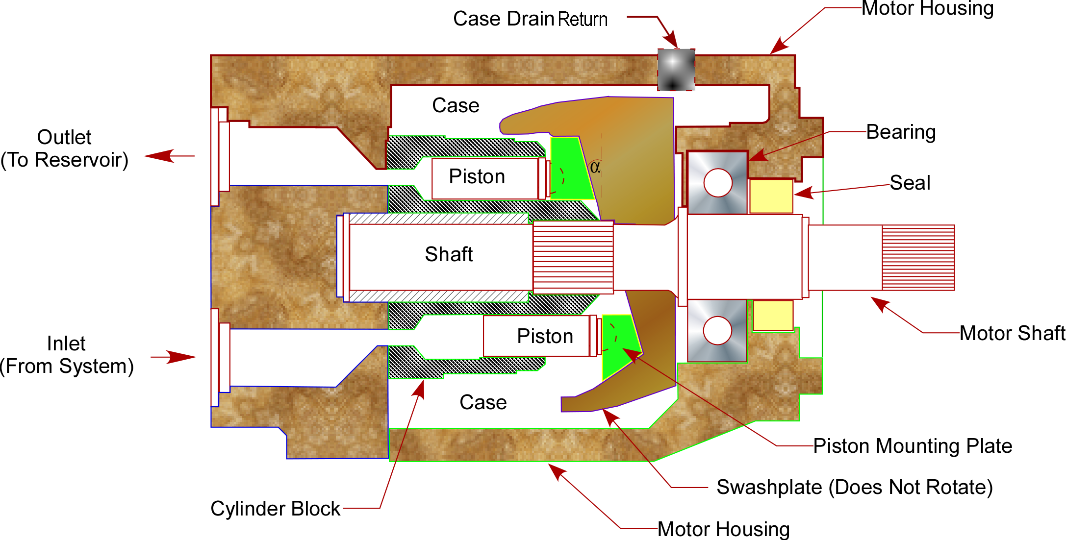پمپهای هيدروليك بصورت عادی مقداری نشتی داخلی دارند و برای جمع آوری روغن نشت شده حفره هایی درون پوسته پمپ تعبيه گرديده كه البته اين نشتی بدليل پك كردن براده های ريز حاصل از فعاليت پيستون درون پمپ مفيد نيز ميباشد همچنين اين روغن باعث خنک کردن پوسته موتورپمپ نيز ميشود.