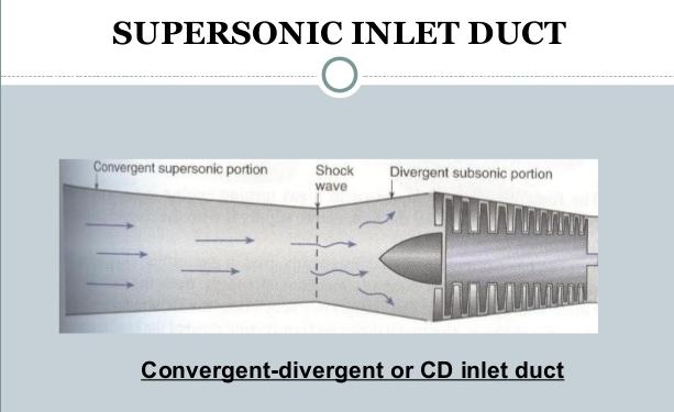 A form of duct, or passage, used for the inlet air to supersonic airplane engines. The forward section of the duct is convergent (it becomes smaller in the direction of the airflow). The air entering the duct at a supersonic speed is slowed to a speed of Mach one by a shock wave in the narrowest part of the duct. Beyond this point, the area of the duct increases-becomes divergent. The air, now traveling slower than the speed of sound, is further slowed, and its pressure increases.