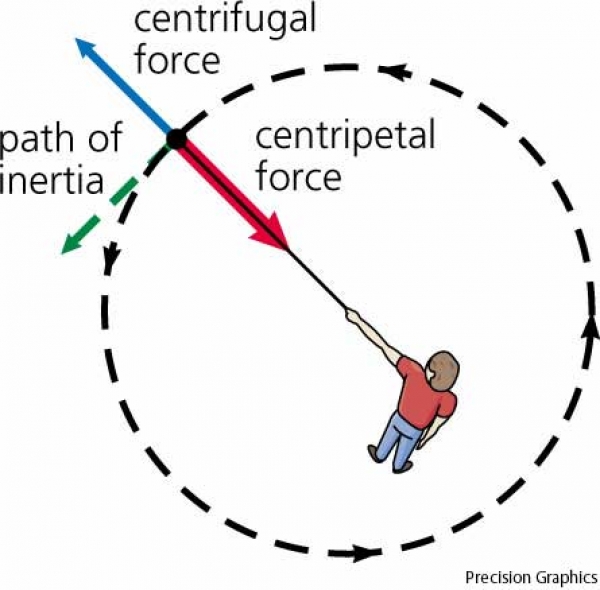 A force that acts outwardly on any body moving in a curved path. centrifugal force tries to move a body away from the center of its rotation, and this force is opposed by centripetal force.